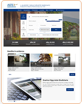 Dall’home page del sito, tramite apposita maschera di ricerca, è possibile consultare le vendite promosse presso i tribunali italiani che dispongono la pubblicità su www.astegiudiziarie.it . La ricerca può essere effettuata in base al genere del bene ricercato (beni immobili, beni mobili, beni immateriali, aziende). La ricerca semplice può esser eseguita per categoria, indirizzo, Tribunale, numero e anno della procedura, fascia di prezzo. Esiste poi la possibilità di effettuare una ricerca avanzata indicando i dati del bene ricercato ed altri dati di tipo procedurale della vendita, nonché filtrando la presenza o meno di allegati fotografici e/o planimetrici, Virtual Tour 360° e Video Hi-Res. C’è inoltre la possibilità di escludere le aste già bandite, o di effettuare la ricerca per le sole vendite a partecipazione telematica.